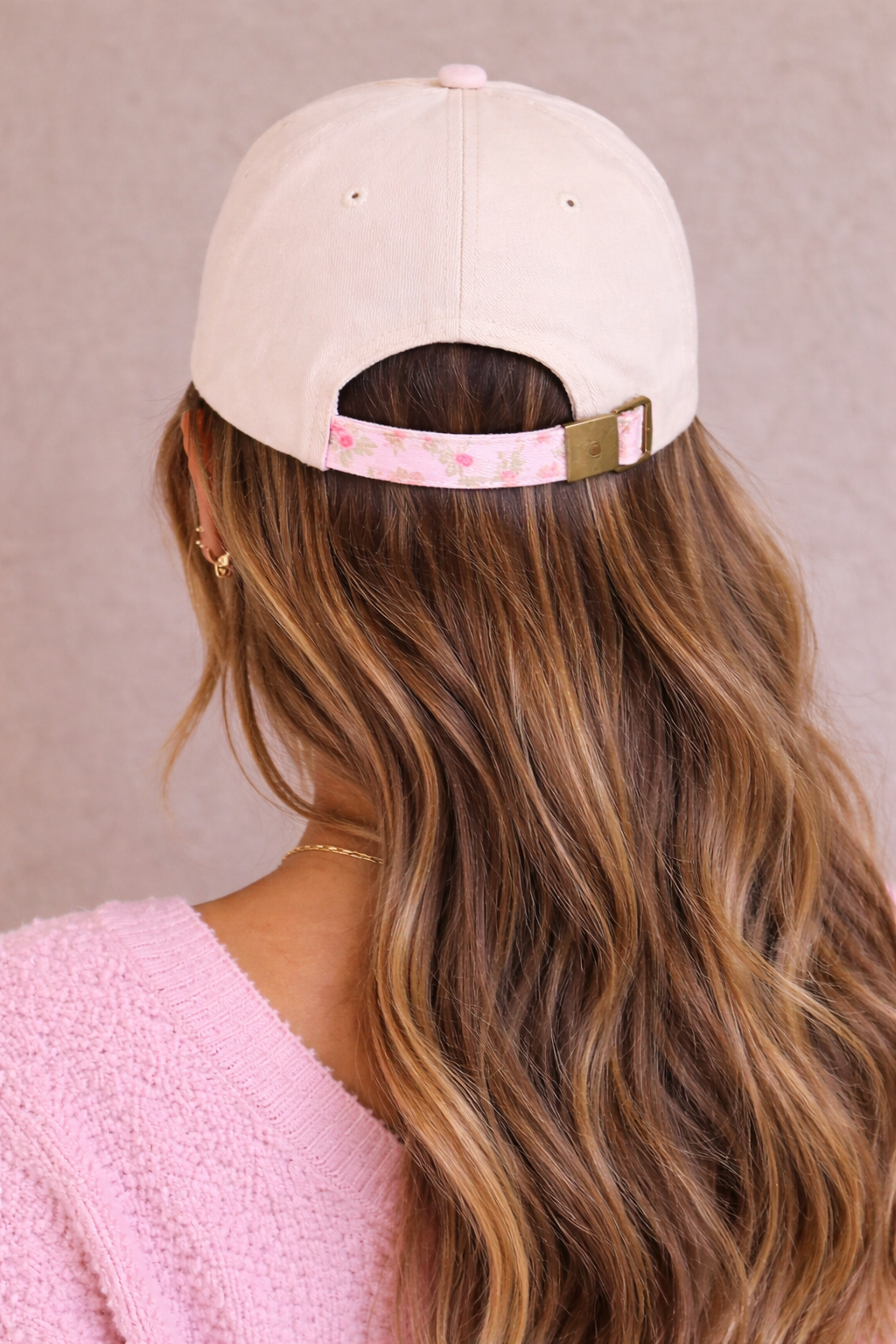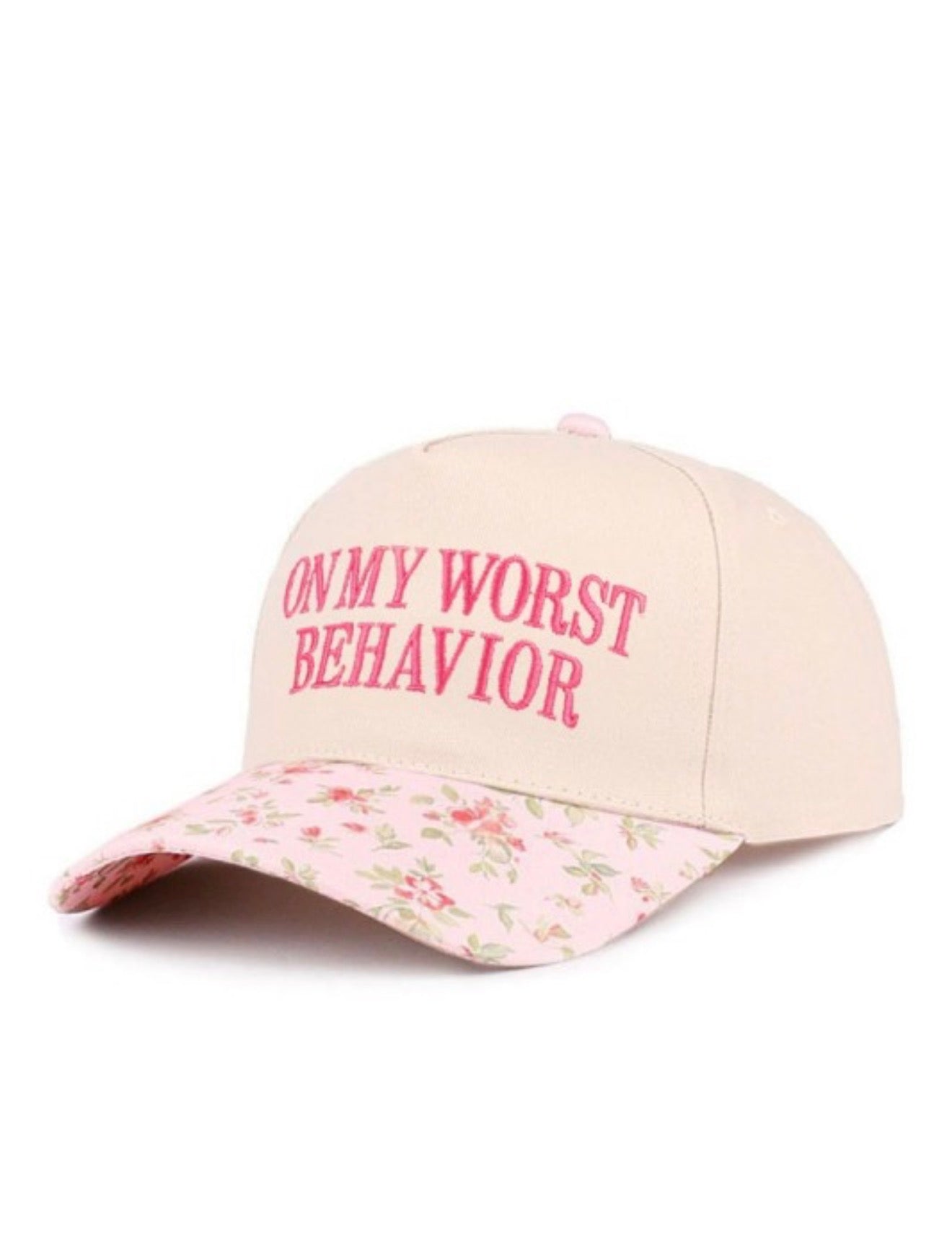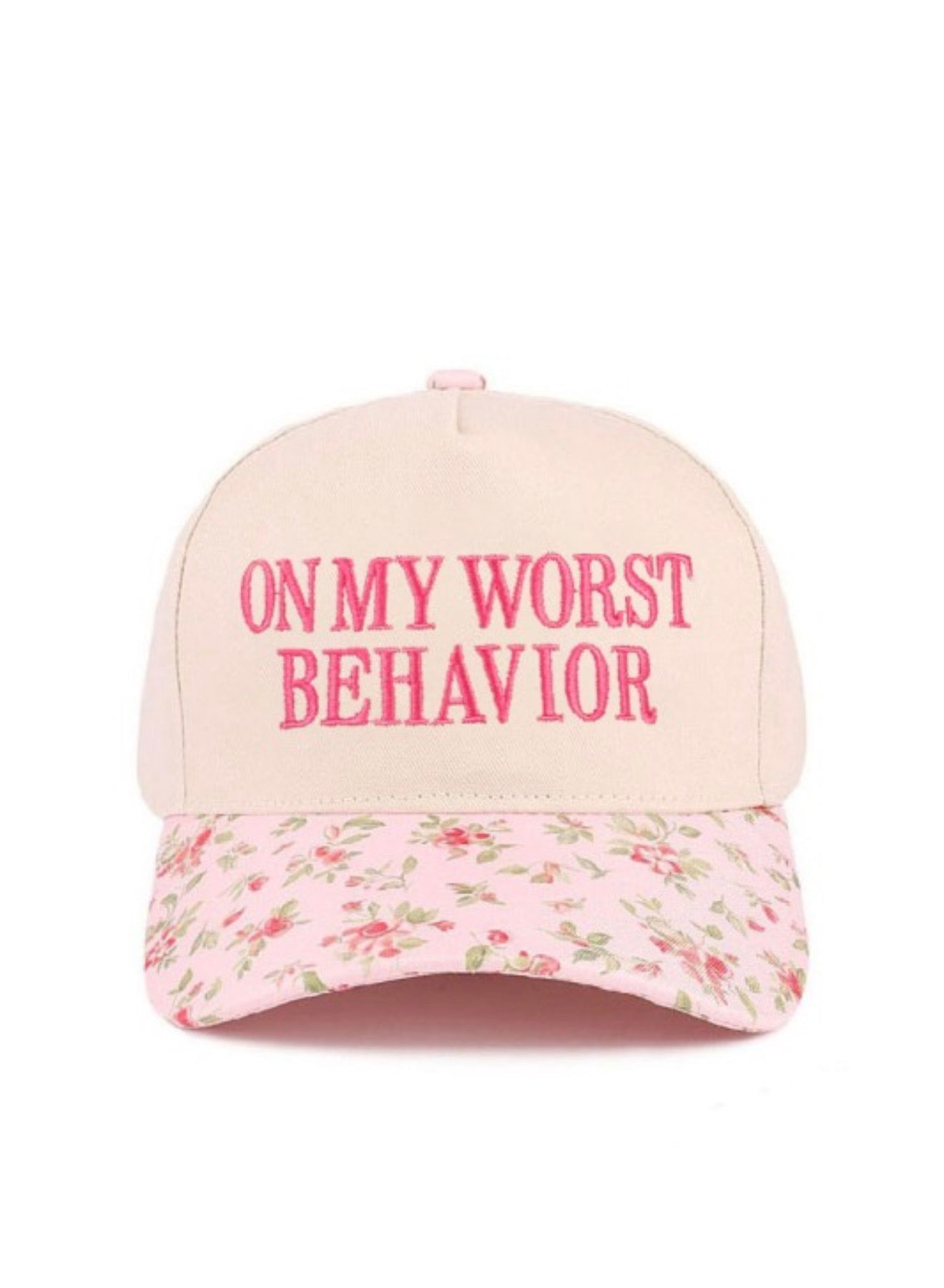 Floral cap, metal clasp and embroidered “On My Worst Behavior”