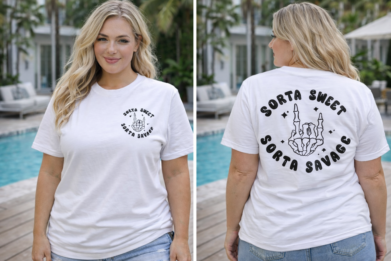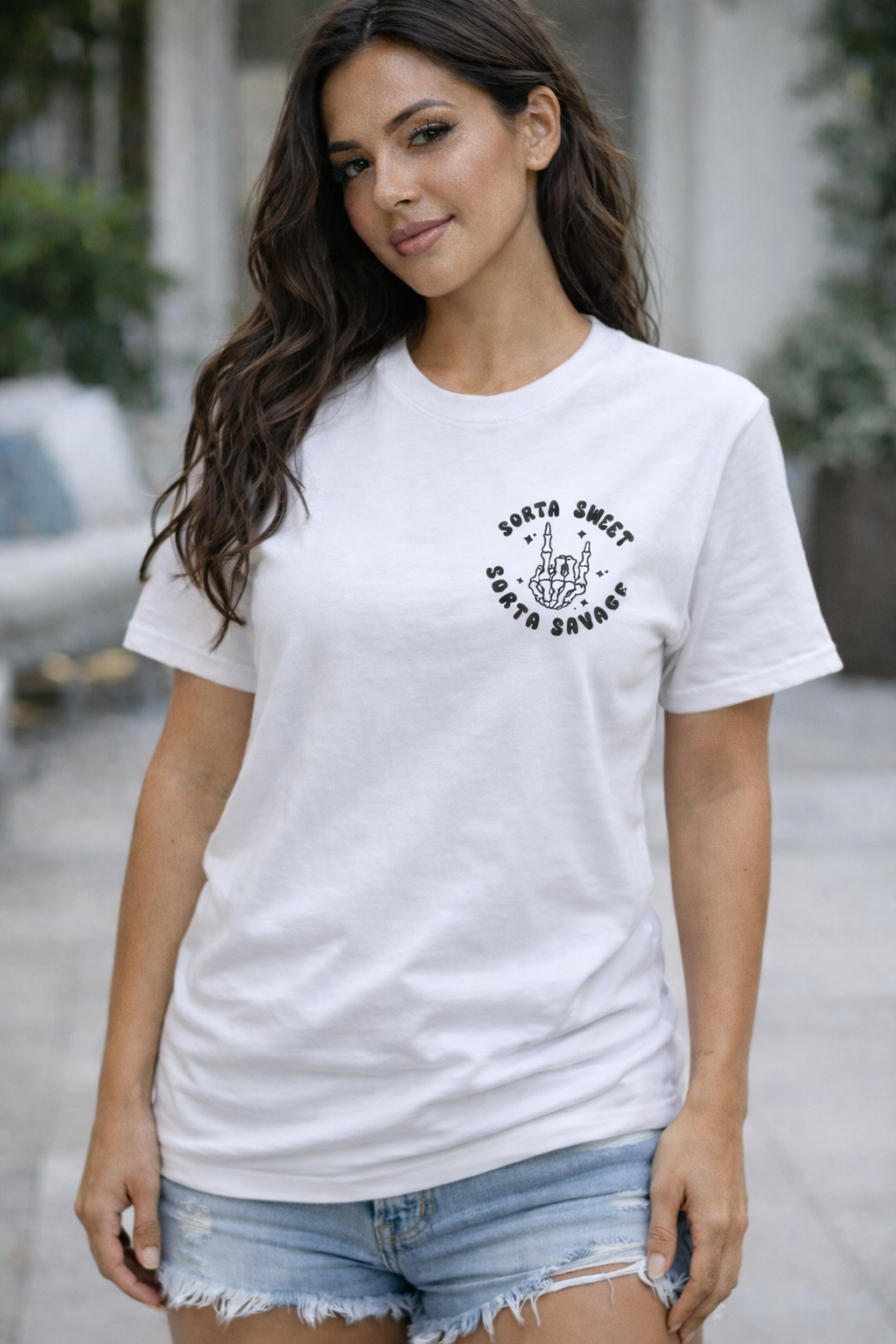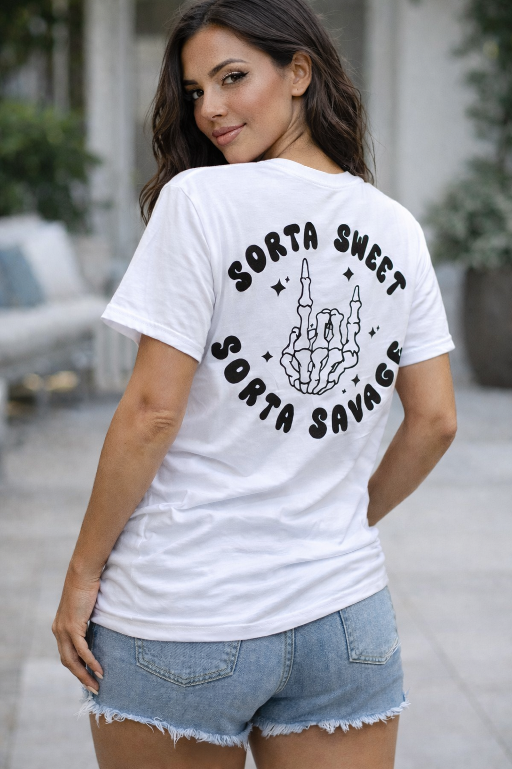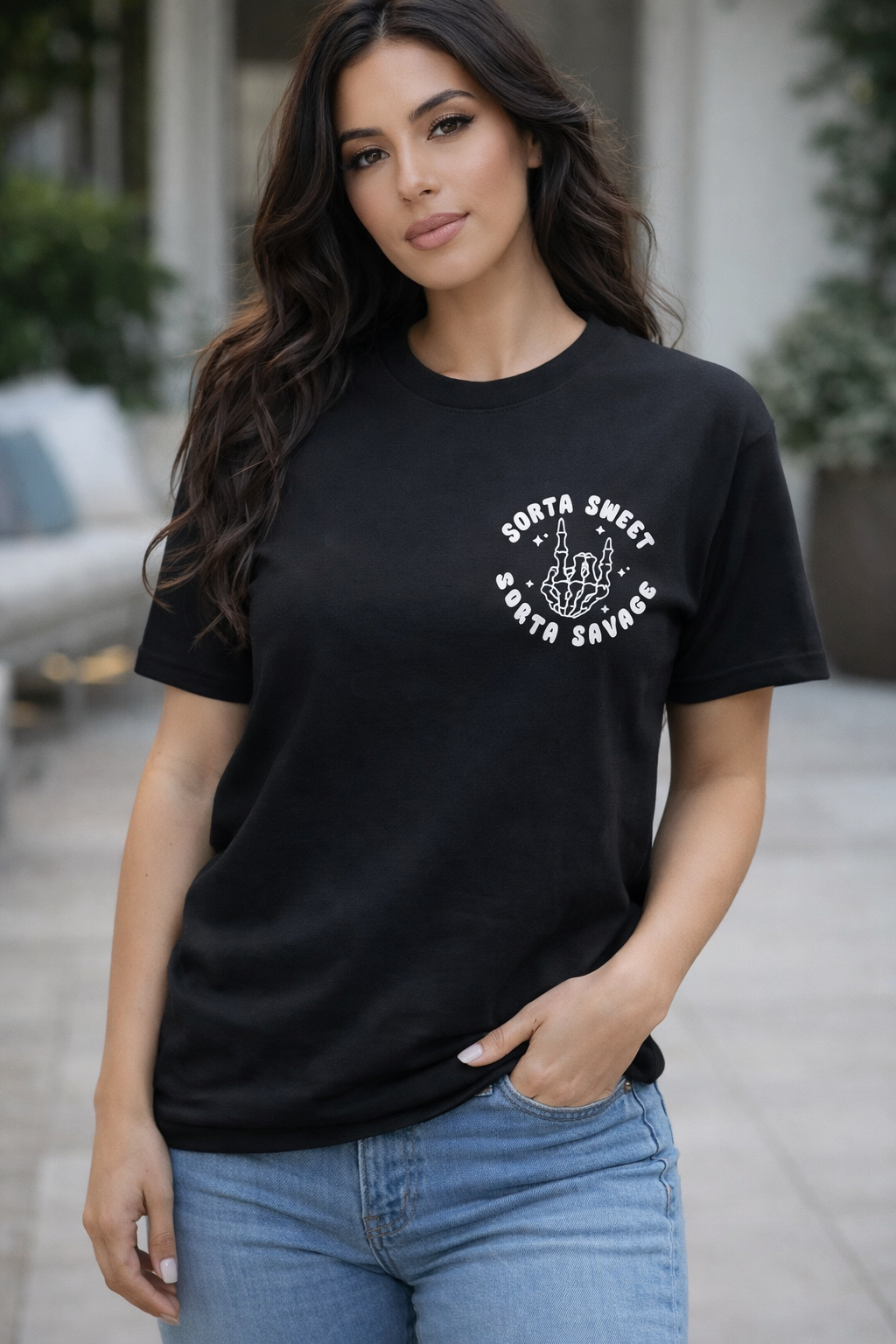 Our Sorta Sweet, Sorta Savage Graphic Tee. On our Soft style tee.
